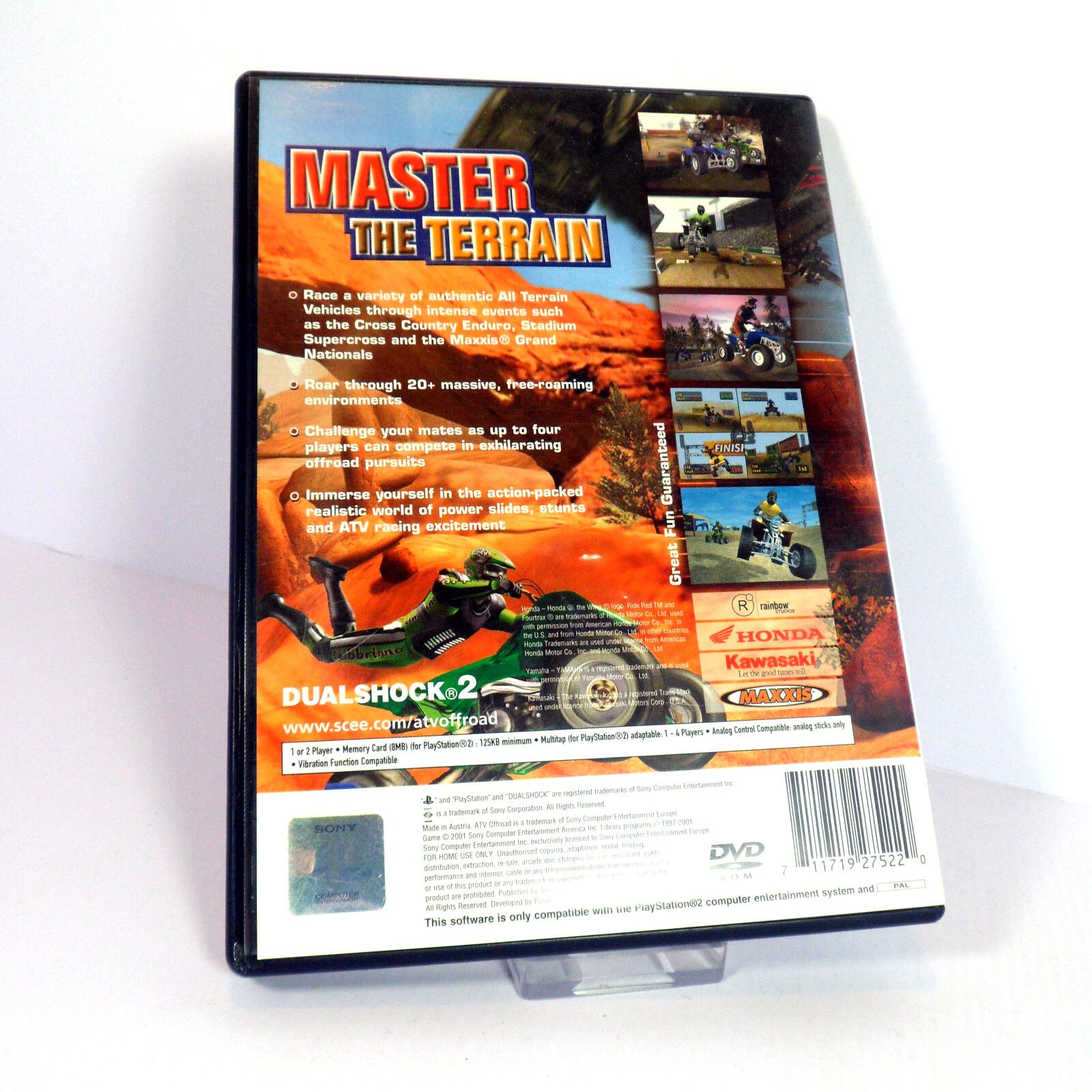 ATV on Sony PlayStation 2. Buy this classic Racing game, originally released in 2001 from a trusted supplier of video games. We use professional disc-cleaners. Photos are stock photos and the item will match condition descriptors below. Unless stated, these are UK PAL GAMES, COMPATIBLE WITH UK, EU & AUSTRALIAN CONSOLES ONLY.